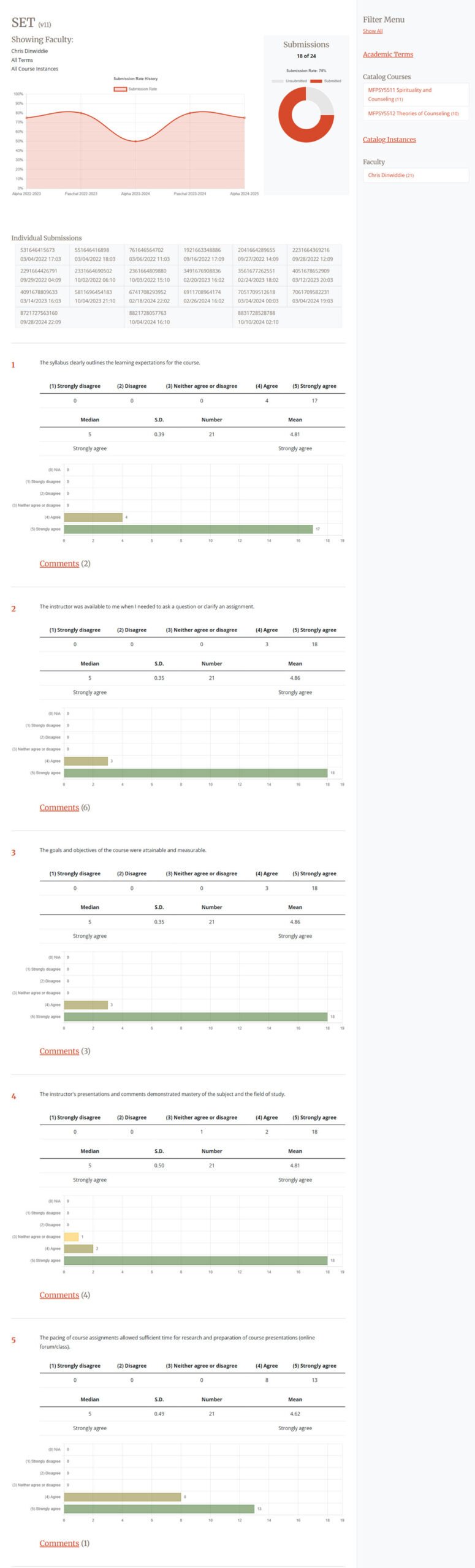 Infographic reporting of student evaluations custom design and programmed for full interactive data aggregation across faculty, terms, courses, and years for administration reporting.
